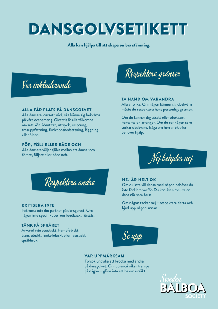 Alla är välkomna i Sweden Balboa Societys verksamhet och alla förväntas följa vår dansgolvsetikett.